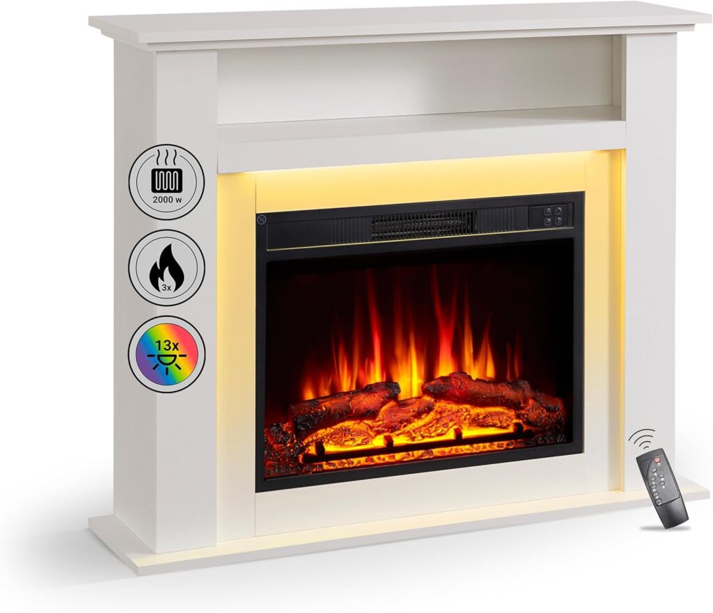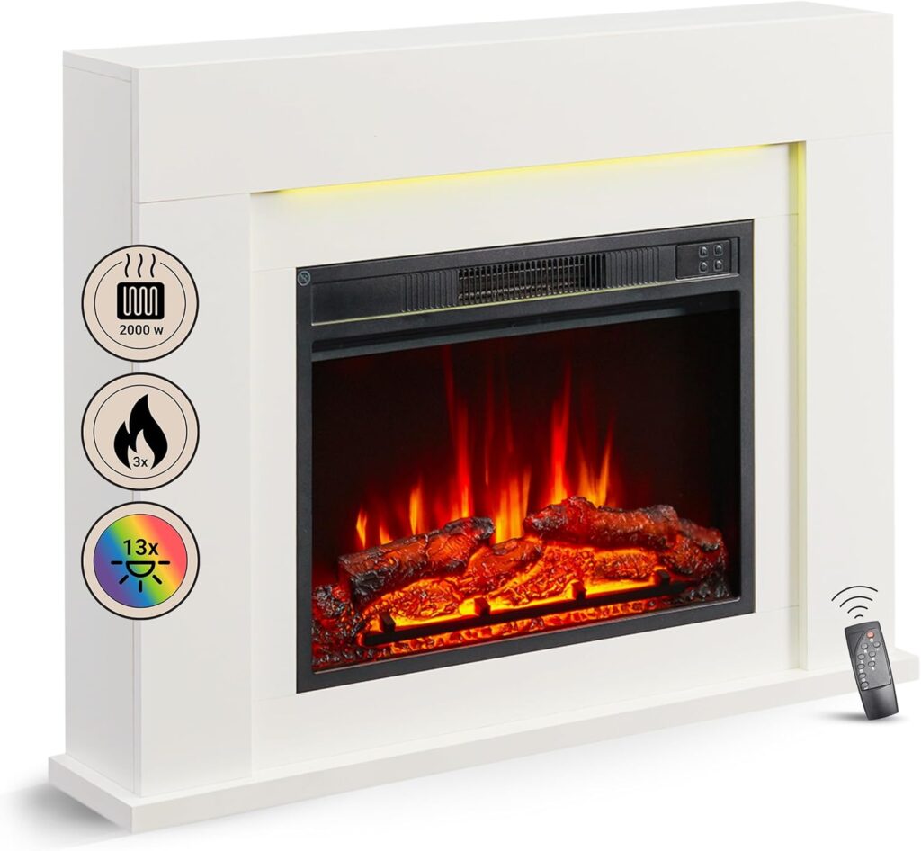 Chimenea eléctrica de pie Baldur | Efecto de llama 3D | Calentador, Calefacción eléctrica 2000W | Iluminación ambiental LED | Mando a distancia, temporizador y termostato | Blanco
